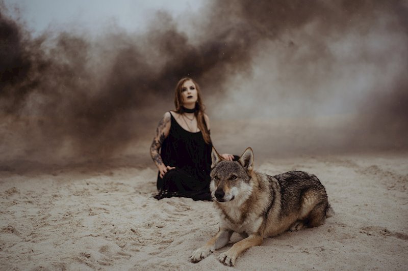 “In the empty space, in the white desert, a lonely woman and a she-wolf are wandering. The smoke of the scorched earth swirls around, the sand is made of the ashes of a dead world. This post-apocalyptic vision is a vision of the future where inevitable destruction lurks. In a local, earthly sense – an ecological catastrophe, in a broader, cosmic sense – entropy and heat death of the universe. Everything is moving towards the ultimate void. Life is only a temporary anomaly in infinite non-existence. Humanity bestowed with painful self-awareness can just wander aimlessly through the wastelands, knowing that the only destiny is going to nowhere.”