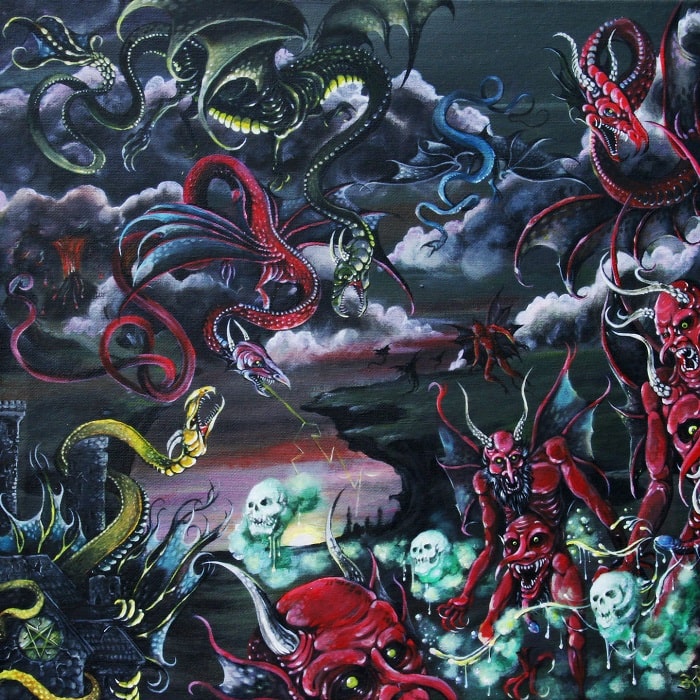 “Polluting the Sanctuary (Revolutions Against Faith)” proves how Daeva sounds authentic and raw while the guitars perfectly mastered a very complex method of solos. Midway through the song, the guitars throw some catchy melodies that build into a dense atmosphere. The band has developed a perfect fusion of old school and modern black metal which by now has become the prominent feature of Daeva’s sinister style. There is also some great drumming on the album that is backed by a steady and audible bass line by Frank Chin. Although it comes as no surprise that Enrique Sagarnaga adds classical rawness to the songs, making use of double bass, blast beats, and cymbal work when necessary. “Itch of the Bottle” is an example of his drumming technique while the mid-tempo overflows with energy the guitar inserts some hooks. The galloping madness contributes to “Luciferian Return” which is the longest track in the album spanning seven minutes, speaking of the guitars there are great hooks and plenty of memorable moments along with the drums that give the song an organic raw feel.