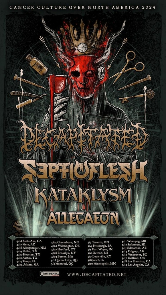 This April/May, ALLEGAEON will be hitting the road with Decapitated, Septicflesh, and Kataklysm for the Cancer Culture Over North America Tour 2024. The tour runs from April 16th through May 19th. Tickets are on sale now. See all confirmed dates below.