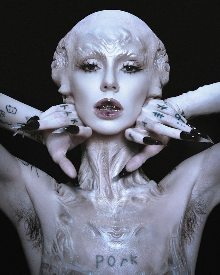 A strikingly visual artist, Bambie’s cinematic videos have seen them transform into a variety of otherworldly characters such as ‘HIM’ from The Powerpuff Girls, a lethal arachnid creature and a vampire bride. No stranger to the big stage, Bambie has played festivals across the world including Glastonbury, Download and Electric Picnic to much critical acclaim. Their show-stopping performances have been described as “a genderqueer, occult-tinged, strikingly theatrical edge” (Evening Standard), and they have received ongoing global support from the likes of NME, Kerrang!, Rolling Stone UK, GAY TIMES, BBC Radio 1, Spotify, Amazon Music and more.