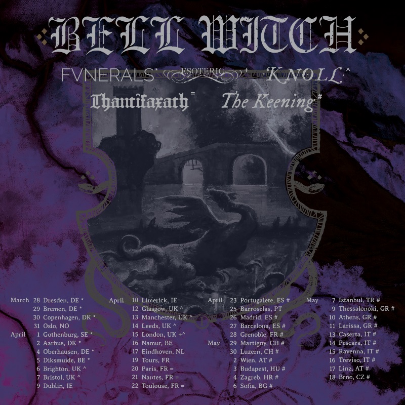 Bell Witch have announced a huge European tour that will run from March through to May, including stops in countries that the band has not previously performed in. The extensive run is in support of the band’s most recent album, Future’s Shadow Part 1: The Clandestine Gate which was announced last April alongside an exclusive full album set at Roadburn festival in The Netherlands. The band returned to Europe in August and September for a string of dates and are now preparing for a eight week reprise. Support for the shows will come from Fvnerals, Knoll, The Keening and Thantifaxath at different points throughout the tour.