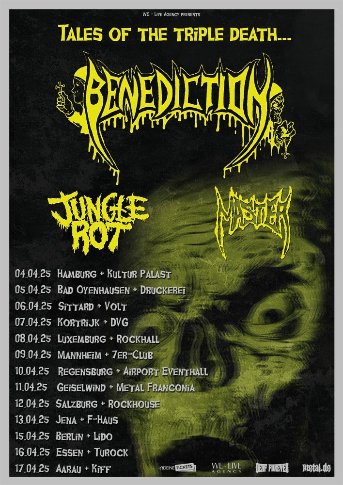 Catch BENEDICTION live on their European release tour in April 2025 with guests Jungle Rot and Master. All confirmed live dates below.