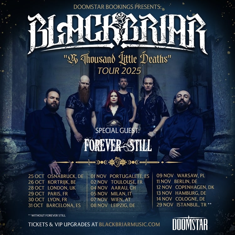 During this busy time, they returned to the studio to record what would become their third full-length, A Thousand Little Deaths, once more with Joost van den Broek at the helm for production. To set some appropriate inspiration and a change of pace, the band ventured back to the ‘mansion’ featured in their “Until Eternity Ends” video and stayed a few days while working on the album. Their first time back since recording that moving video, it allowed them to tap into their roots while still keeping their eyes ever-forward. Set to release this summer through Nuclear Blast Records, expect BLACKBRIAR to once again raise the stakes in all aspects of their revered sound. In keeping the band’s tradition of direct connection to fans alive, they launched another triumphant pre-order campaign at the end of February. To celebrate the release of A Thousand Little Deaths, the band will be departing on their first full headline tour of Europe this fall with Danish act Forever Still as their special guest, beginning in October 2025.