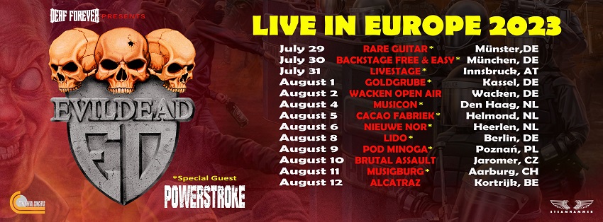 EVILDEAD will start their European tour tomorrow in Münster, Germany with scheduled festival appearances at Wacken (DE), Brutal Assault (CZ) and Alcatraz Open Air (BE).