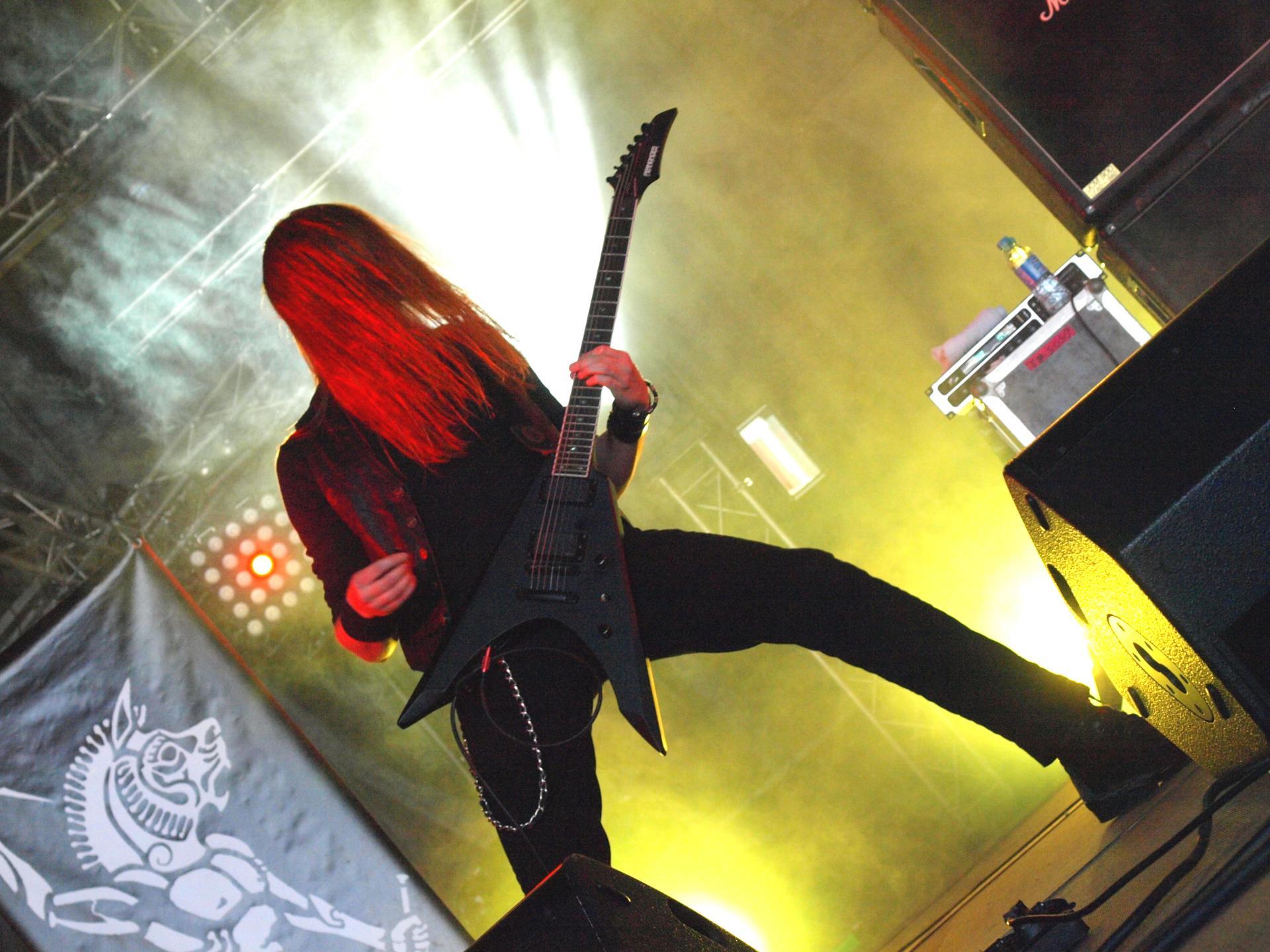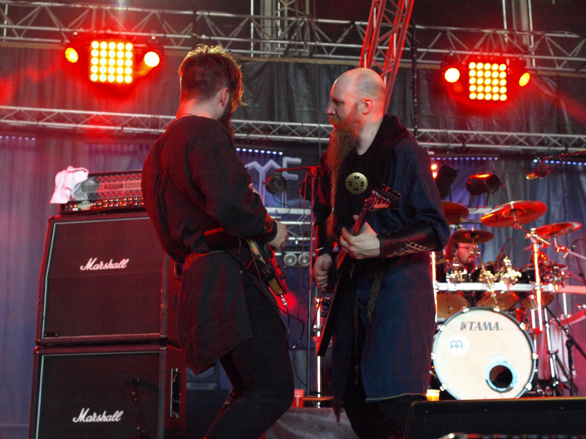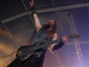 De folk/pagan-metal van Skyforger uit Letland blies een storm door the Temple. Met traditionele folknummers en teksten vanuit de Letse mythologie stormden deze bebaarde heren over het podium. Wat altijd leuk is bij een folk metal band is als ook de kleding meehelpt om in de sfeer te komen. Het was een geweldige show, waarbij alle bandleden alles van zichzelf gaven, met uitbundige bewegingen en zelfs rollen over het podium. Nog redelijk vroeg op de stikhete dag werkte dit alles uit tot een geweldige show in een enthousiast gevulde tent, wellicht opgestookt door het enorme enthousiasme van de band zelf (zie foto’s).