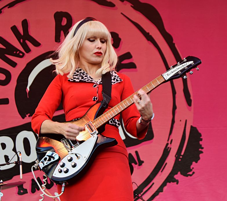 The Street Party Stage is completely rocking to the sound of Kate Clover and her band. Kate is resplendent in a red 50s pencil dress with leopard trim and is flanked by her black suited, white shirted band, a classic look.