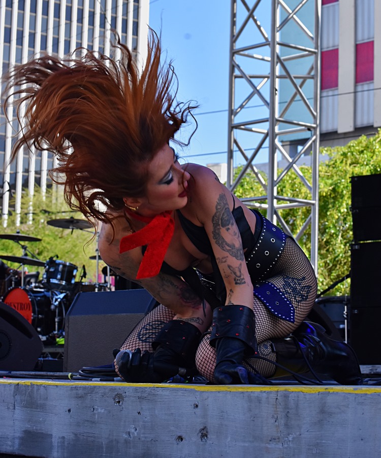 Niis (pronounced nice) from Los Angeles took to the main stage, and it was as if a hurricane had blown in. Flame haired singer Mimi SanDoe was taking no prisoners as she marauded around the stage clad in a black leather bikini, fishnet stockings and calf-length boots. A fearsome sight to behold.