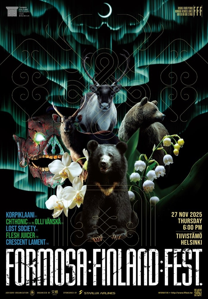 F:F:F is also part of “Taiwan European Culture Connect 2025,” a year-long program launched by Taiwan’s Ministry of Foreign Affairs and Ministry of Culture. So far, the GACC has organized over 70 Taiwanese cultural events across 26 European countries. In Finland, heavy metal serves as a loud and powerful voice for intercultural dialogue. The F:F:F visual identity continues the theme of the colon – a symbol of dialogue, connection, and collaboration.