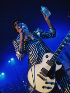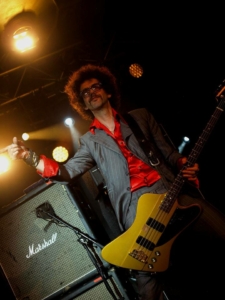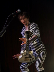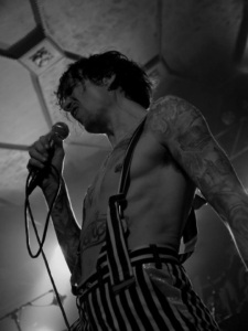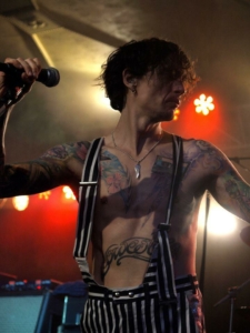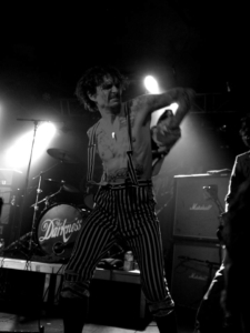 Al bij het 3e nummer (‘Black Shock‘) gaan de kleren uit. Een stomende Hawkins schudt al zijn ledematen heen en weer waardoor het niet echt geweldig lukt van de eerste keer, maar dan kan hij toch verder gaan in bloot bovenlijf met bretellen. We mochten 3 nummers fotograferen, maar hij lijkt toch al ongeduldig te worden en port bij het refrein al met zijn microfoon in de lens van de fotograaf naast mij, alsof de camera zou moeten meezingen. Ik ga alvast verder van het podium af staan, en merk later dat hij een andere fotograaf zijn camera nog heeft afgepakt. Vreemde kuren, die Justin.