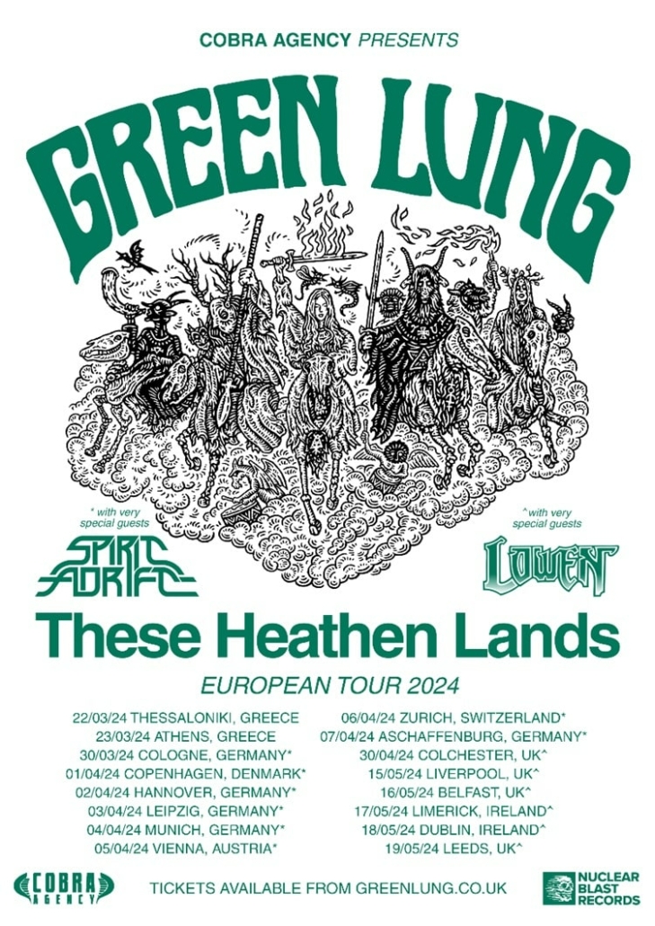 GREEN LUNG‘s third studio album, This Heathen Land, was released last week via Nuclear Blast Records. To celebrate, the band have revealed a new video for the track ‘Hunters In The Sky’, and revealed a host of UK/European tour dates for 2024 with support from LOWEN and SPIRIT ADRIFT.