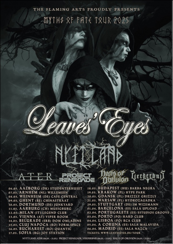 As mentioned, the group have kicked off their 2025 European tour in Aalborg, Denmark last night to gather symphonic and viking fanatics once again. Also performing under the “Myths Of Fate” banner are promising support acts: NYTT LAND (Mar 6-21), ATER (Mar 6-21), PROJECT RENEGADE (Mar 6-13), VERDERBNIS (Mar 6-13) and HALLS OF OBLIVION (Mar 14-21). The second part of the run (Stuttgart, DE + 6 Iberian dates) will see local bands taking the stage to warm-up the crowds for LEAVES’ EYES.