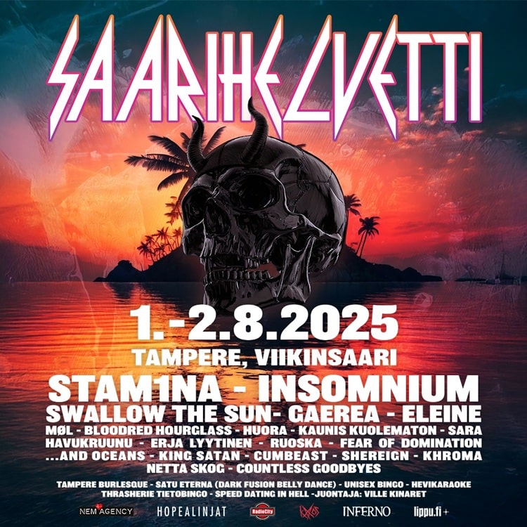 A festival in Tampere, one of Finland’s nicest cities, on an island in the middle of the big lake the city right in its center, with a lineup that mostly heralds Finnish bands but with every edition a nice and interesting selection of foreign acts, aptly named SaariHelvetti (Island of Hell). What more could you wish for as a metalhead? After last year’s great line-up for the 10th anniversary, what they cooked up this time is pretty great as well, where you’ll find some of the best of the Finnish scene there with Stam1na, Swallow The Sun, Kaunis Kuolematon, Havukruunu, Ruoska, Cumbeast, Insomnium, Bloodred Hourglass, Huora, …and Oceans,… and a special 10 Year Anniversary Show of the local King Satan! But it’s not all Finnish, SaariHelvetti is also flying over the Swedish dark symphonic revelation Eleine, extreme metal greats Gaerea and the Danish post-black outfit MØL to the island! And you won’t even have to miss out on any of the bands if you don’t want to, because the performances alternate between the 2 stages there without any overlaps. But if you want to skip an artist, you’ll find plenty of other things to occupy yourself with for instance the yearly “Speed dating in Hell”, and the shows from Tampere Burlesque‘s finest. So get your tickets, and catch yourself a boat to the best island in Finland!