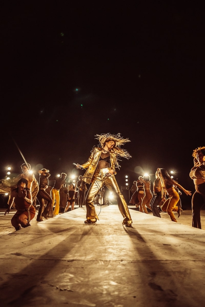 Shot deep in the Mojave Desert, the jaw-dropping, golden-hued companion film finds Miss Velvet striding a gilded runway in a gold suit by Gabriela Hearst – a designer who’s woven female empowerment into her brand DNA –, flanked by animated bandmates and a diverse troupe of dancers. Miss Velvet approaches performing, on stage and screen, as she does walking the red carpet at Fashion Week events in Paris, Milan, or New York – with impeccable style, instinctive class, and singular poise.