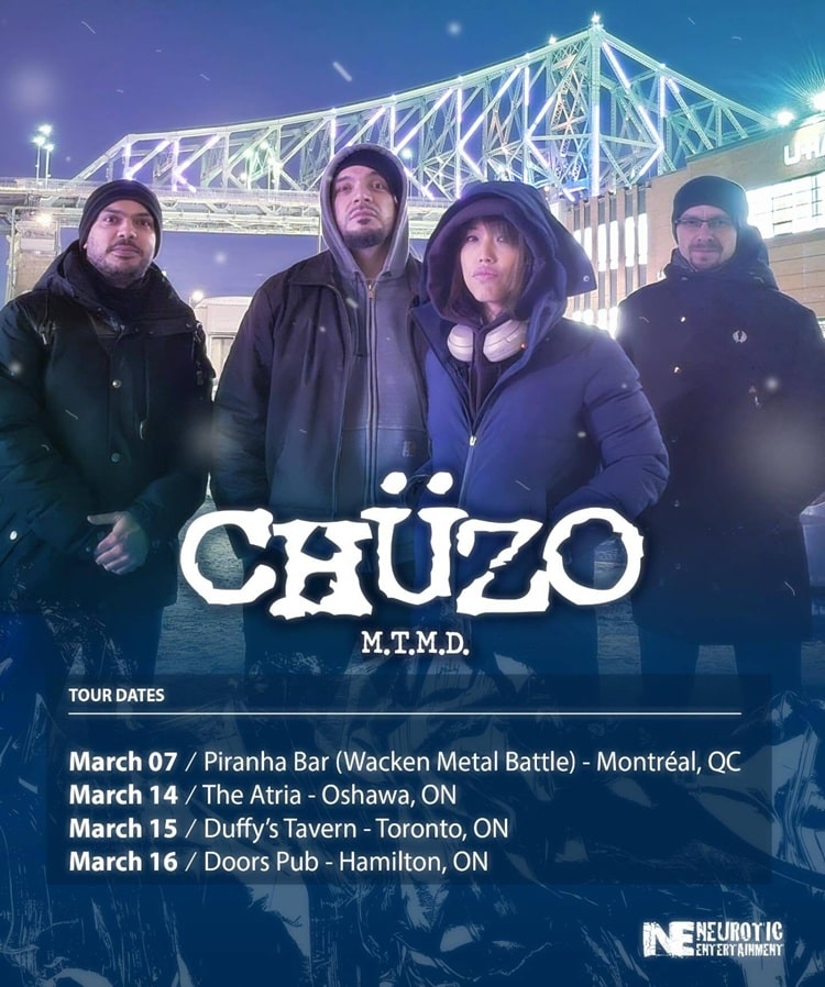 CHÜZO‘s new lineup features the ensnaring vocals of Taiwanese Brazilian transplant Mischa M joining local first-generation Chilean Canadian and mastermind Cristian S. along with Carlos G from Venezuela and Alex S from Russia who all have found Montreal, Canada to be their home-to-breed their blender of grindcore, Swedish death metal, thrash, and hardcore punk to transform a sub-genre dubbed ‘Aggro Metal’.
