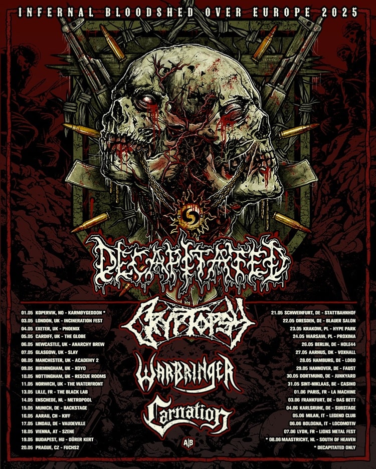 WARBRINGER are currently gearing up to embark on the massive “Infernal Bleeding Over Europe 2025” tour in support of death metal legends Decapitated alongside Cryptopsy, and Carnation kicking off May 3, 2025 at London’s Incineration fest. See the complete list of dates below.