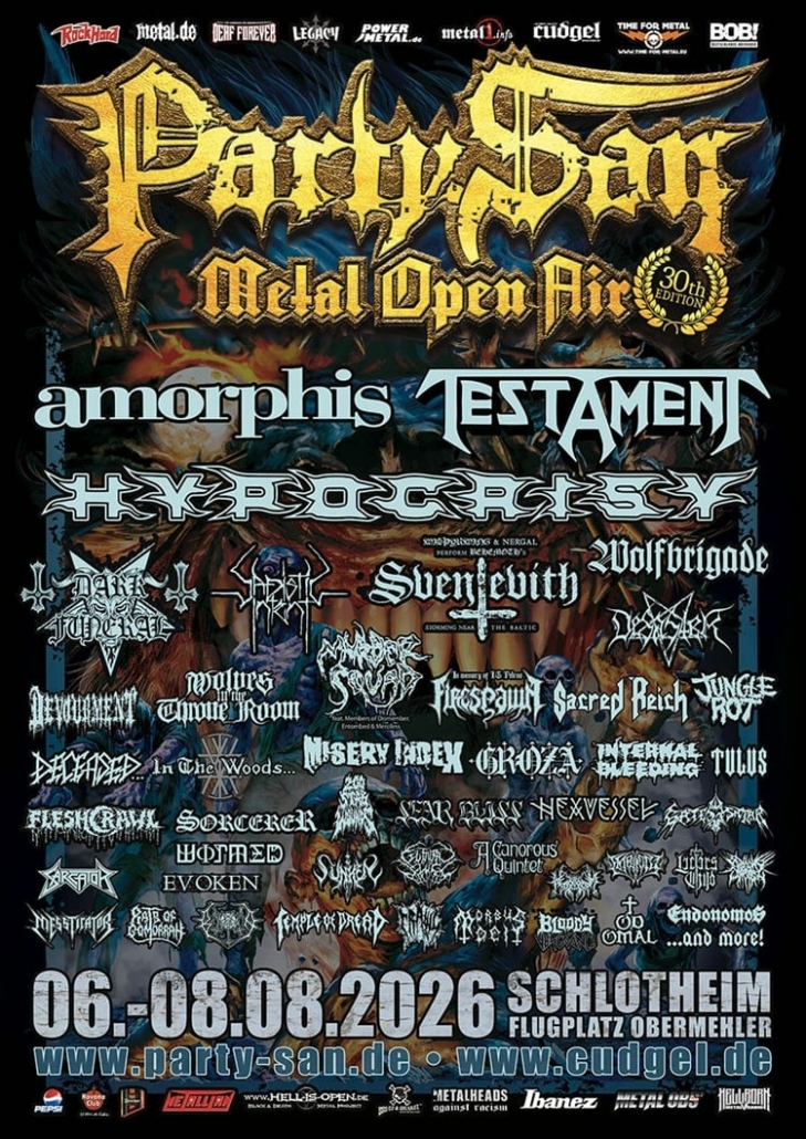 Party.San Metal Open Air will take place for the 30th time from 6 to 8 August 2026, once again at Obermehler airfield near Schlotheim in Germany, roughly a four-hour drive from the Dutch border. The festival is known for its focus on the more extreme and heavy corners of metal, including death, black, grind, thrash, d-beat, and doom.