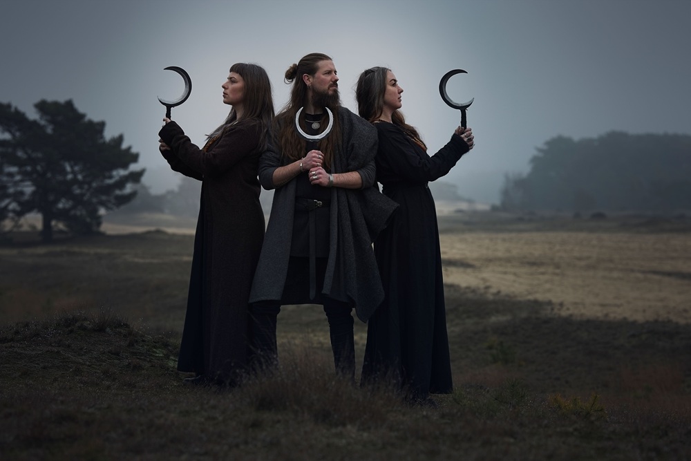 “Sōl ond Māni” takes inspiration from Scandinavian mythology. Carried along over a slow pounding of drums by carnyx, tagelharpa and other ancestral instruments, grieving vocals tell the story of the Sun and the Moon being chased by two mythological wolves until the time of Ragnarök. Moving from whispered incantation to feral howl, the song descends into a place where myth, memory and mourning coalesce.