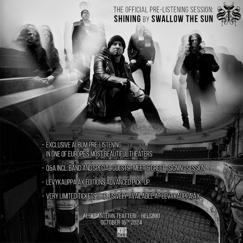 Moreover, SWALLOW THE SUN will host a unique and exclusive event at the beautiful Aleksanterin Teatteri in Helsinki on October 16th, 2024. Their upcoming studio album Shining will be listened to in its entirety, before its official release on October 18th. Please note the band will not perform at the event.