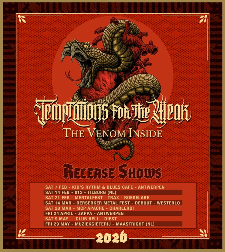 To promote The Venom Inside, an extensive club tour through Belgium and the Netherlands kicks off on February 7, 2026. Additionally, the band is confirmed for major festivals including Alcatraz and Area 53. These releases showcase the album’s broad musical identity: from melodic emotion to crushing groove passages and epic solos.