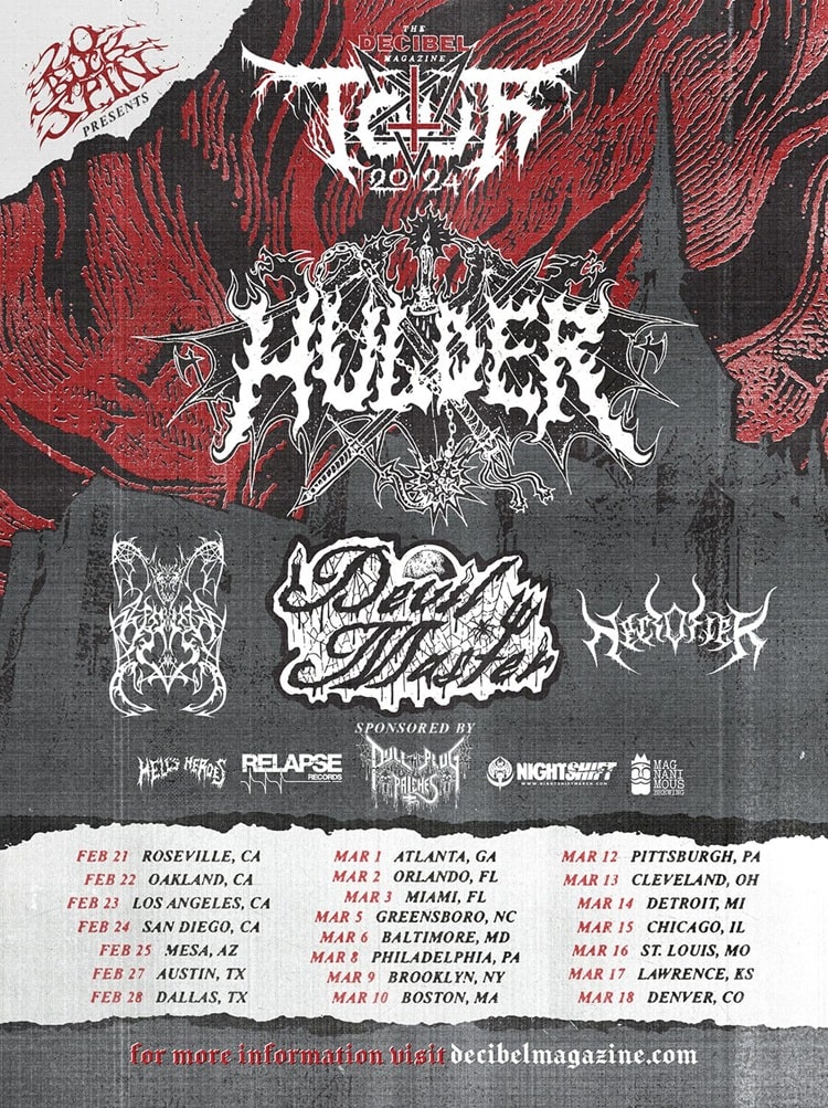 Having been featured on the cover of Decibel Magazine in late 2022, HULDER will embark on the Decibel Magazine Tour of the US with labelmates Worm, as well as Devil Master and Necrofier. Presented by 20 Buck Spin, and sponsored by Pull The Plug Patches, Relapse Records, Night Shift Merch, Hell’s Heroes, and Magnanimous Brewing, the tour will run from February 21st through March 18th.