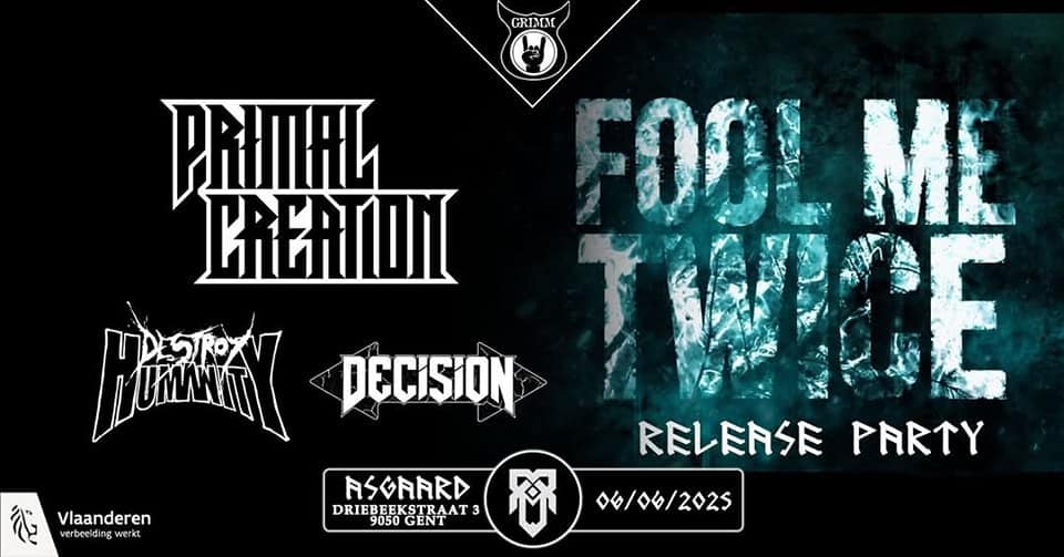 The song launches the new line-up of Primal Creation into a packed 2025 festival season with appearances at a.o. Antwerp Metal Fest (Madball, Cancer, Sinister, …) and Alcatraz Festival (Machine Head, Kreator, Mastodon, …). But also a special ‘Fool Me Twice’ release party at our very own Asgaard with support from Destroy Humanity and Decision!
