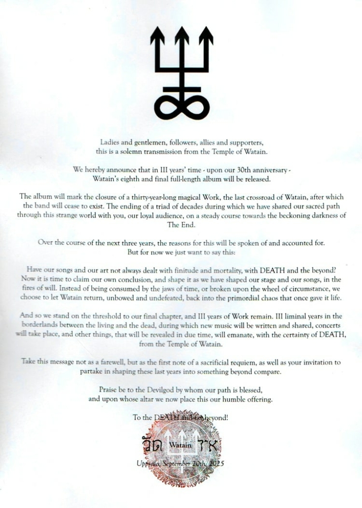 Have our songs and our art not always dealt with finitude and mortality, with DEATH and the beyond? Now it is time to claim our own conclusion, and shape it as we have shaped our stage and our songs, in the fires of will. Instead of being consumed by the jaws of time, or broken upon the wheel of circumstance, we choose to let Watain return, unbowed and undefeated, back into the primordial chaos that once gave it life.