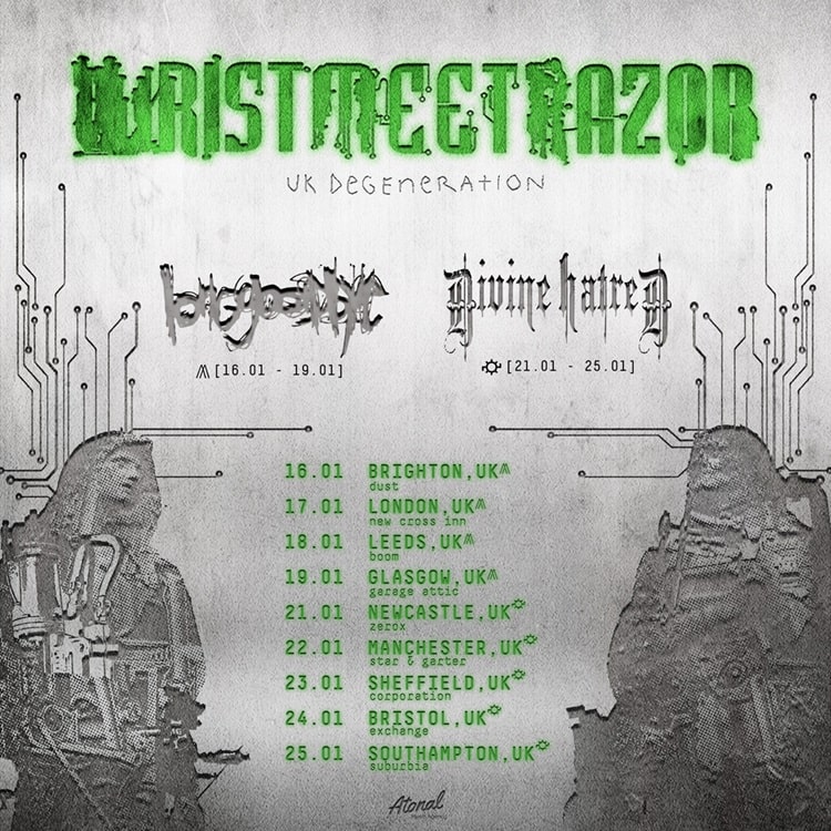 Seeking to ensure a fully realised aesthetic to represent the absurdity of seeking justice in an unjust world, the cover was put together by Philadelphia, PA visual artist Alex Eckman-Lawn (END, Dim Mak, Woe). Merging what was once flesh with machine and technology, Degeneration’s visual presentation is a towering counterpart to WRISTMEETRAZOR’s bleakest album to date.